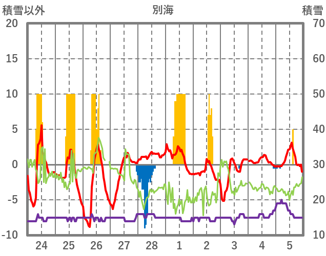 | 日 | 時 | 気温 | 降水 | 風向/風速 | 日照 | 積雪 | 降雪 |