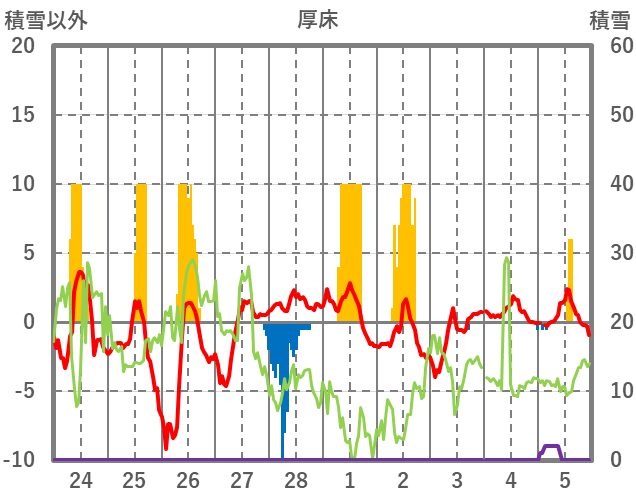 | 日 | 時 | 気温 | 降水 | 風向/風速 | 日照 | 積雪 | 降雪 |