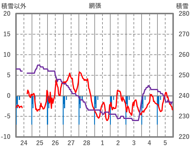 | 日 | 時 | 気温 | 降水 | 風向/風速 | 日照 | 積雪 | 降雪 |