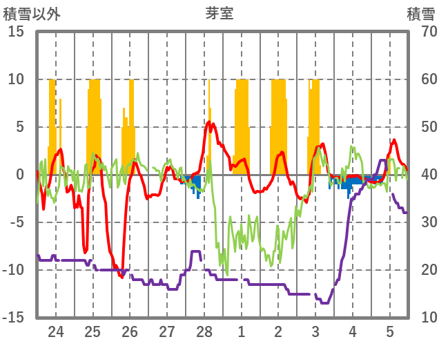 | 日 | 時 | 気温 | 降水 | 風向/風速 | 日照 | 積雪 | 降雪 |