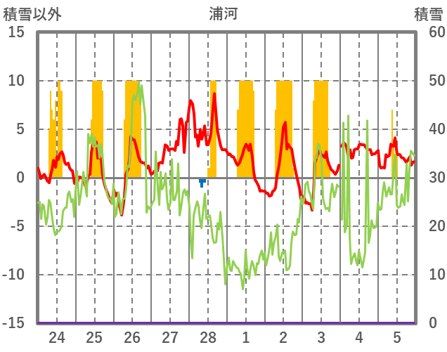| 日 | 時 | 気温 | 降水 | 風向/風速 | 日照 | 積雪 | 降雪 |