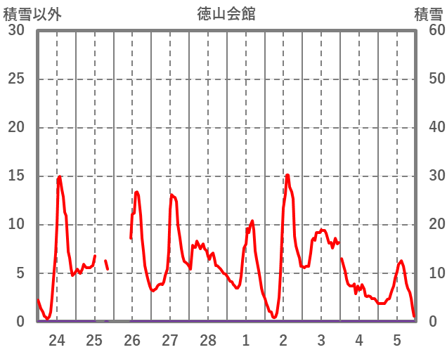 | 日 | 時 | 気温 | 降水 | 風向/風速 | 日照 | 積雪 | 降雪 |