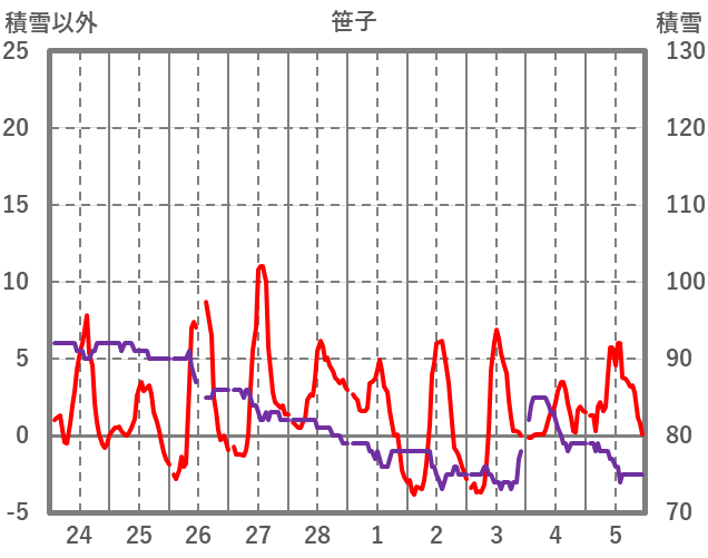 | 日 | 時 | 気温 | 降水 | 風向/風速 | 日照 | 積雪 | 降雪 |