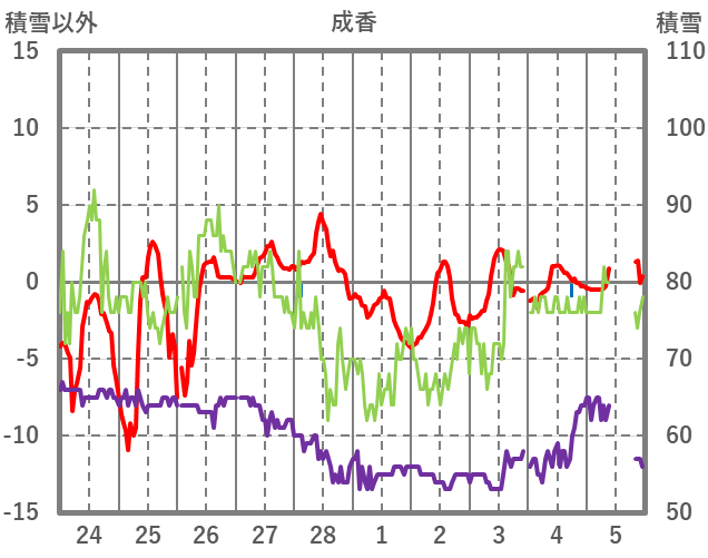 | 日 | 時 | 気温 | 降水 | 風向/風速 | 日照 | 積雪 | 降雪 |