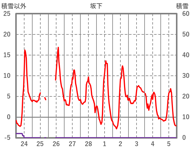 | 日 | 時 | 気温 | 降水 | 風向/風速 | 日照 | 積雪 | 降雪 |