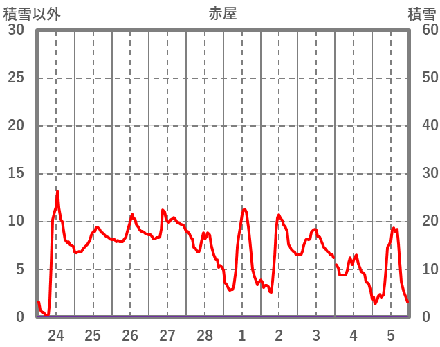 | 日 | 時 | 気温 | 降水 | 風向/風速 | 日照 | 積雪 | 降雪 |