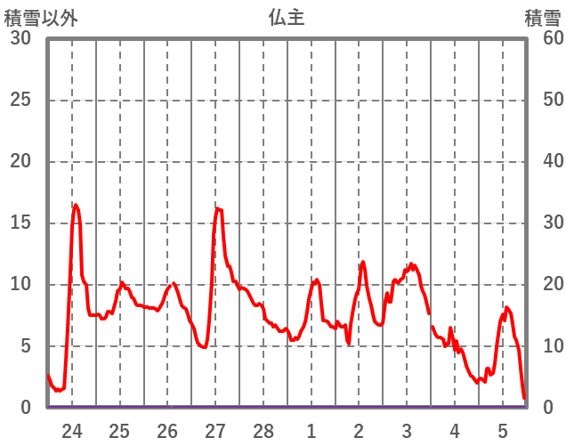 | 日 | 時 | 気温 | 降水 | 風向/風速 | 日照 | 積雪 | 降雪 |