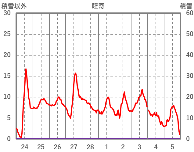 | 日 | 時 | 気温 | 降水 | 風向/風速 | 日照 | 積雪 | 降雪 |