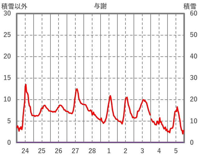 | 日 | 時 | 気温 | 降水 | 風向/風速 | 日照 | 積雪 | 降雪 |