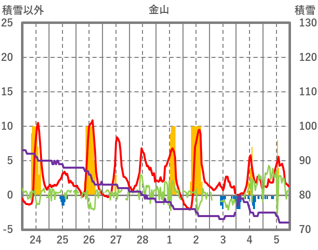 | 日 | 時 | 気温 | 降水 | 風向/風速 | 日照 | 積雪 | 降雪 |