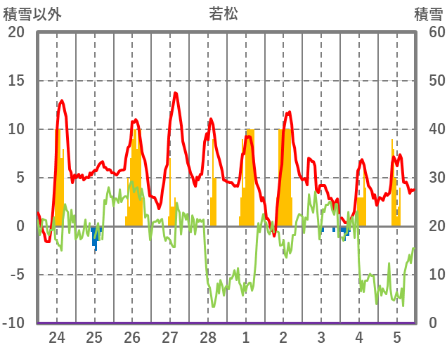 | 日 | 時 | 気温 | 降水 | 風向/風速 | 日照 | 積雪 | 降雪 |