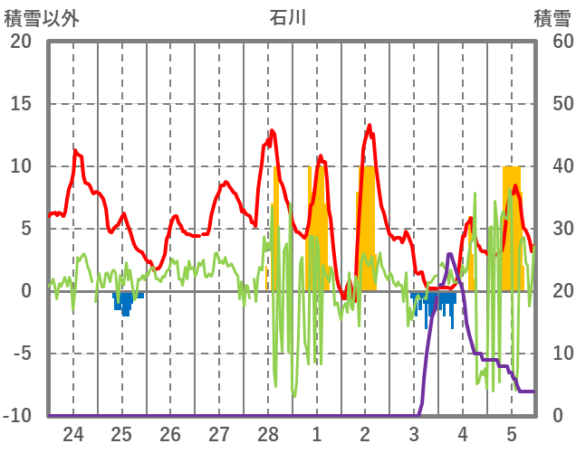 | 日 | 時 | 気温 | 降水 | 風向/風速 | 日照 | 積雪 | 降雪 |