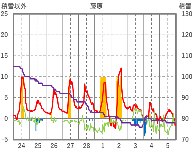 | 日 | 時 | 気温 | 降水 | 風向/風速 | 日照 | 積雪 | 降雪 |