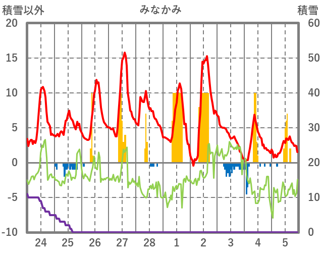 | 日 | 時 | 気温 | 降水 | 風向/風速 | 日照 | 積雪 | 降雪 |