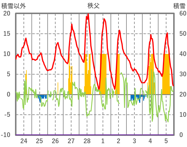 | 日 | 時 | 気温 | 降水 | 風向/風速 | 日照 | 積雪 | 降雪 |