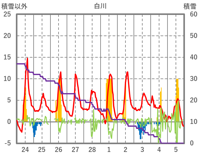 | 日 | 時 | 気温 | 降水 | 風向/風速 | 日照 | 積雪 | 降雪 |