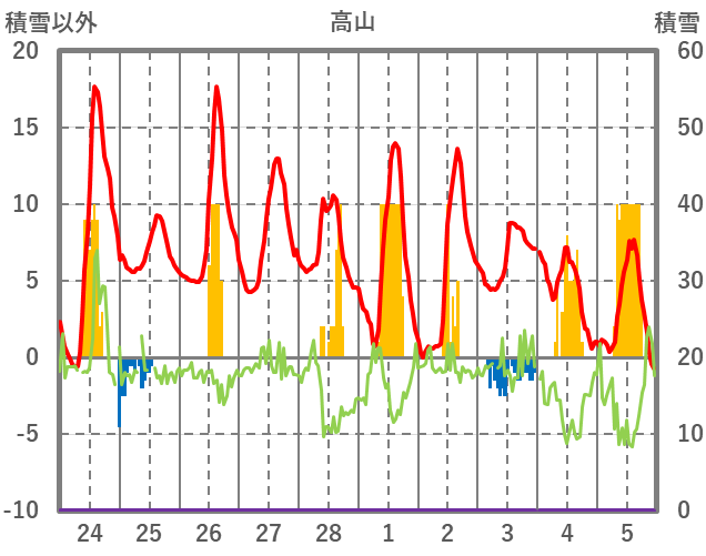 | 日 | 時 | 気温 | 降水 | 風向/風速 | 日照 | 積雪 | 降雪 |