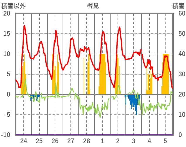 | 日 | 時 | 気温 | 降水 | 風向/風速 | 日照 | 積雪 | 降雪 |