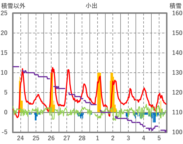 | 日 | 時 | 気温 | 降水 | 風向/風速 | 日照 | 積雪 | 降雪 |