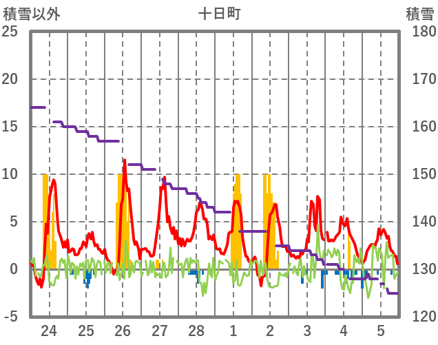 | 日 | 時 | 気温 | 降水 | 風向/風速 | 日照 | 積雪 | 降雪 |