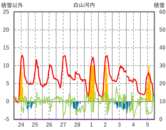 | 日 | 時 | 気温 | 降水 | 風向/風速 | 日照 | 積雪 | 降雪 |