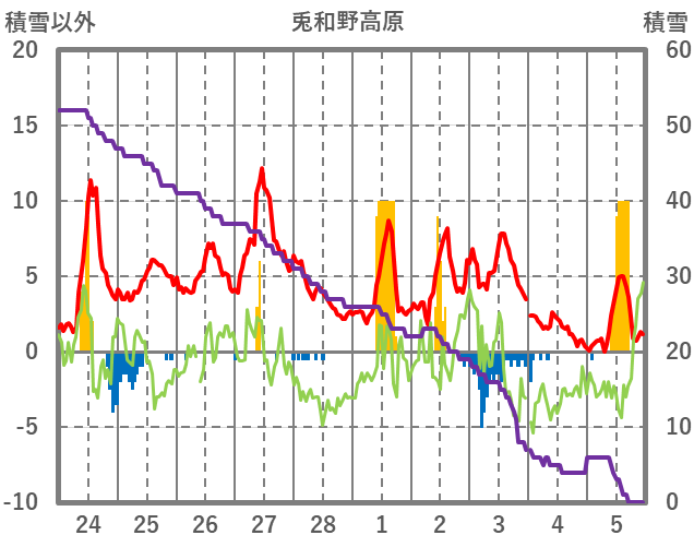 | 日 | 時 | 気温 | 降水 | 風向/風速 | 日照 | 積雪 | 降雪 |