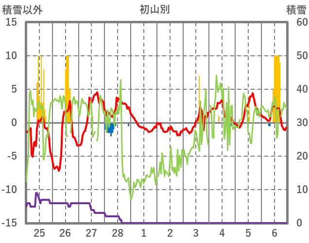 | 日 | 時 | 気温 | 降水 | 風向/風速 | 日照 | 積雪 | 降雪 |