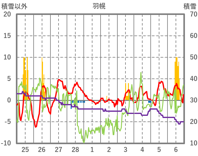 | 日 | 時 | 気温 | 降水 | 風向/風速 | 日照 | 積雪 | 降雪 |