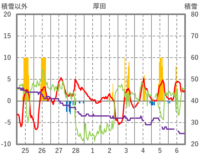 | 日 | 時 | 気温 | 降水 | 風向/風速 | 日照 | 積雪 | 降雪 |