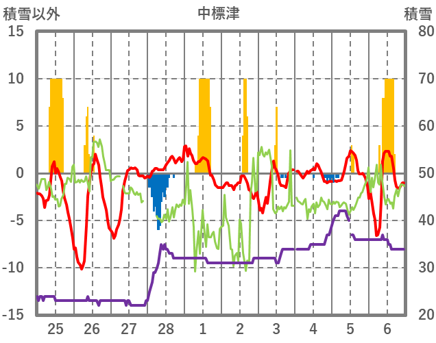 | 日 | 時 | 気温 | 降水 | 風向/風速 | 日照 | 積雪 | 降雪 |