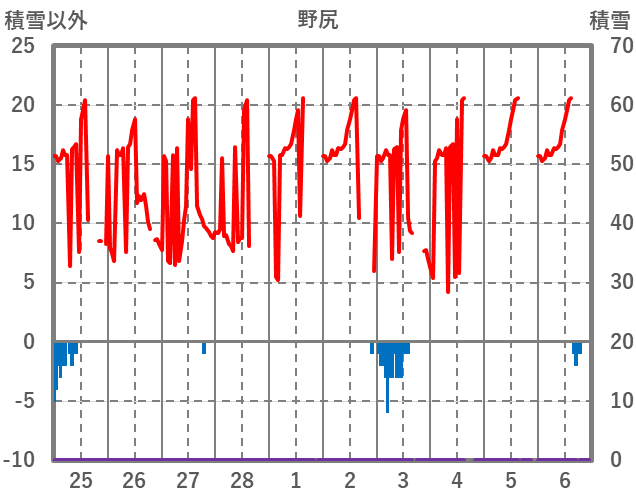 | 日 | 時 | 気温 | 降水 | 風向/風速 | 日照 | 積雪 | 降雪 |