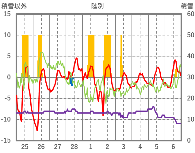 | 日 | 時 | 気温 | 降水 | 風向/風速 | 日照 | 積雪 | 降雪 |