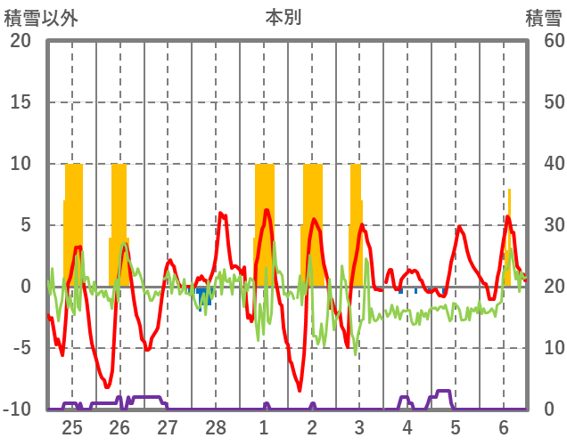 | 日 | 時 | 気温 | 降水 | 風向/風速 | 日照 | 積雪 | 降雪 |