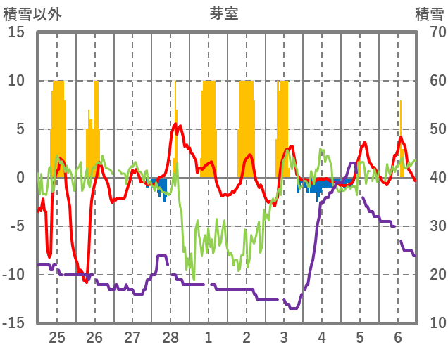 | 日 | 時 | 気温 | 降水 | 風向/風速 | 日照 | 積雪 | 降雪 |