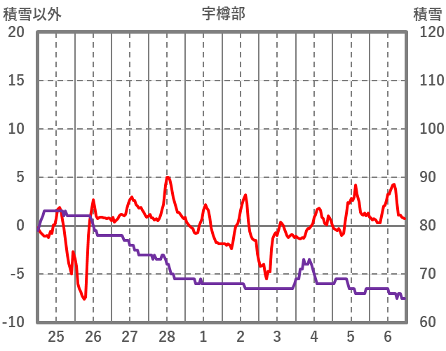 | 日 | 時 | 気温 | 降水 | 風向/風速 | 日照 | 積雪 | 降雪 |