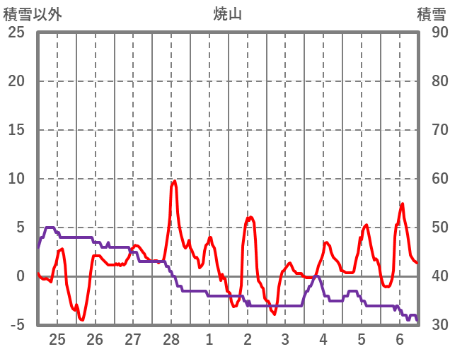 | 日 | 時 | 気温 | 降水 | 風向/風速 | 日照 | 積雪 | 降雪 |