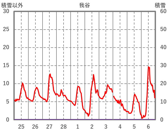 | 日 | 時 | 気温 | 降水 | 風向/風速 | 日照 | 積雪 | 降雪 |