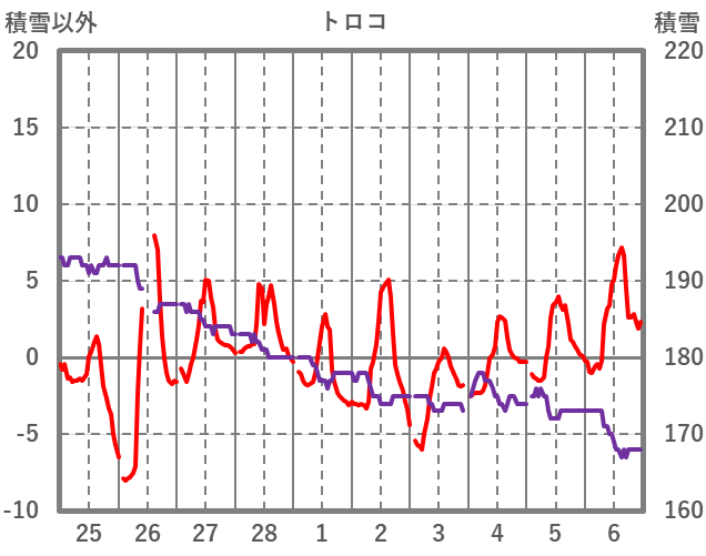 | 日 | 時 | 気温 | 降水 | 風向/風速 | 日照 | 積雪 | 降雪 |