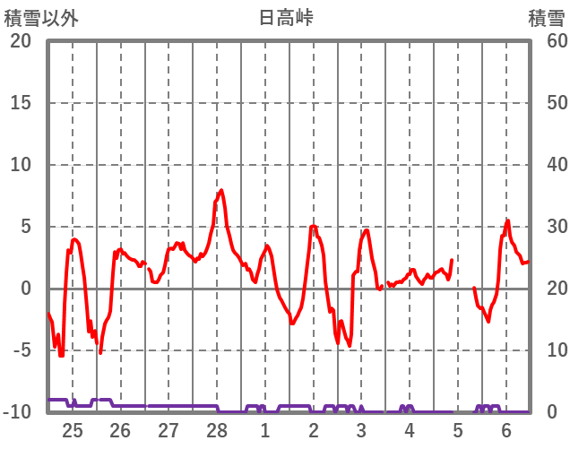 | 日 | 時 | 気温 | 降水 | 風向/風速 | 日照 | 積雪 | 降雪 |