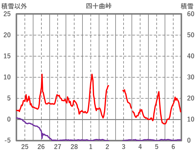 | 日 | 時 | 気温 | 降水 | 風向/風速 | 日照 | 積雪 | 降雪 |