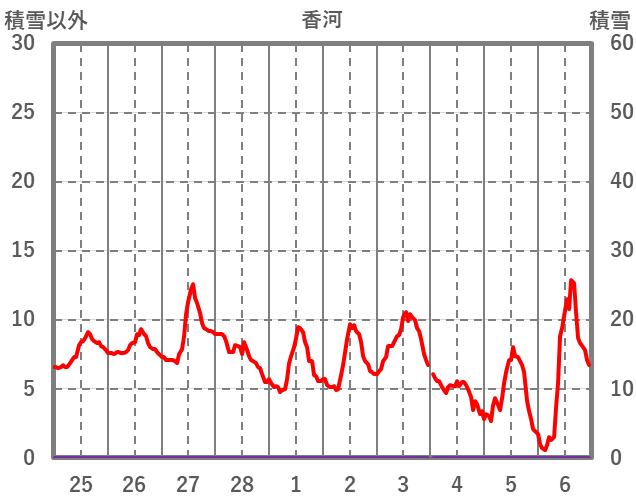 | 日 | 時 | 気温 | 降水 | 風向/風速 | 日照 | 積雪 | 降雪 |