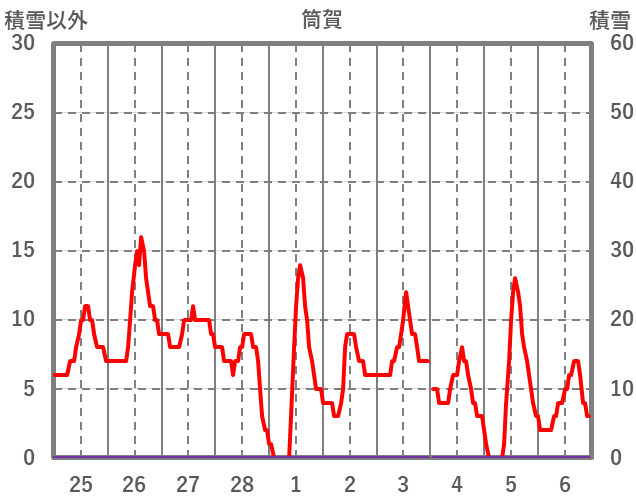 | 日 | 時 | 気温 | 降水 | 風向/風速 | 日照 | 積雪 | 降雪 |