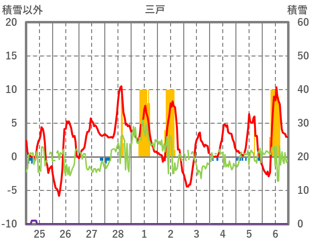 | 日 | 時 | 気温 | 降水 | 風向/風速 | 日照 | 積雪 | 降雪 |