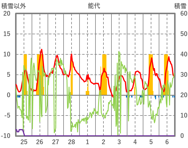 | 日 | 時 | 気温 | 降水 | 風向/風速 | 日照 | 積雪 | 降雪 |