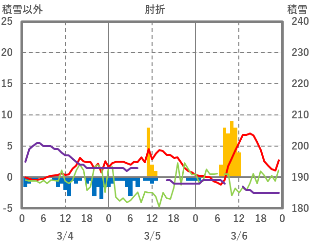 | 日 | 時 | 気温 | 降水 | 風向/風速 | 日照 | 積雪 | 降雪 |