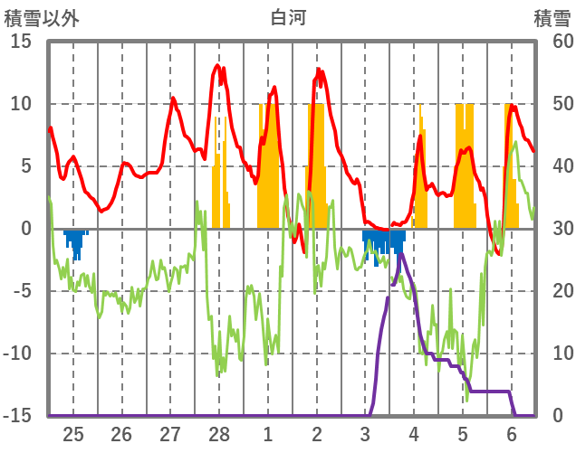 | 日 | 時 | 気温 | 降水 | 風向/風速 | 日照 | 積雪 | 降雪 |