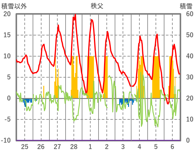 | 日 | 時 | 気温 | 降水 | 風向/風速 | 日照 | 積雪 | 降雪 |