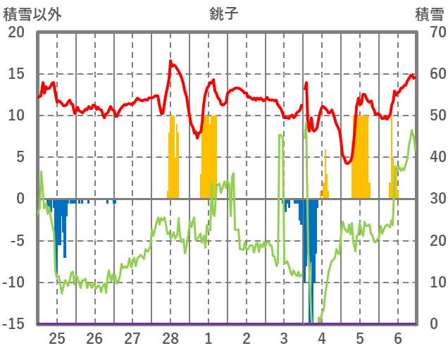 | 日 | 時 | 気温 | 降水 | 風向/風速 | 日照 | 積雪 | 降雪 |