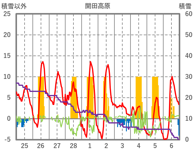 | 日 | 時 | 気温 | 降水 | 風向/風速 | 日照 | 積雪 | 降雪 |
