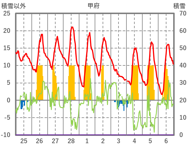 | 日 | 時 | 気温 | 降水 | 風向/風速 | 日照 | 積雪 | 降雪 |